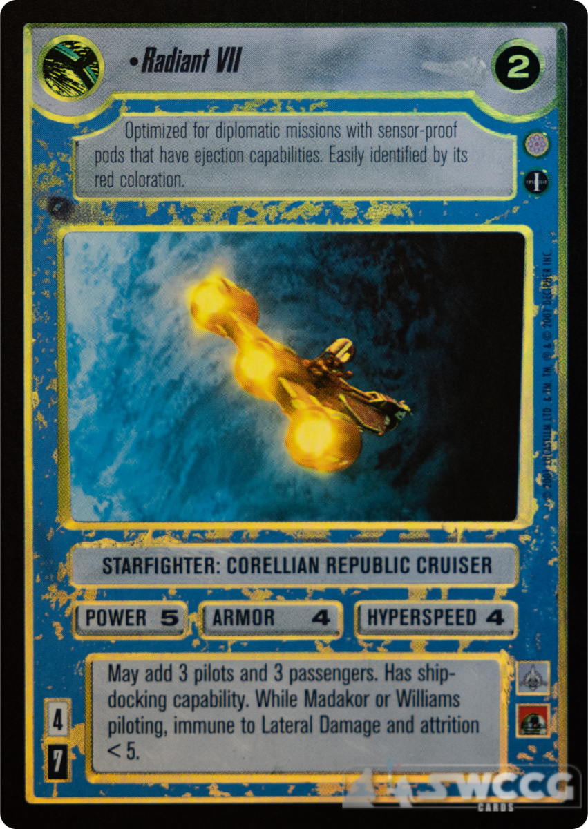 May add 3 pilots and 3 passengers. Has ship-docking capability. While Madakor or Williams piloting, immune to Lateral Damage and attrition < 5.