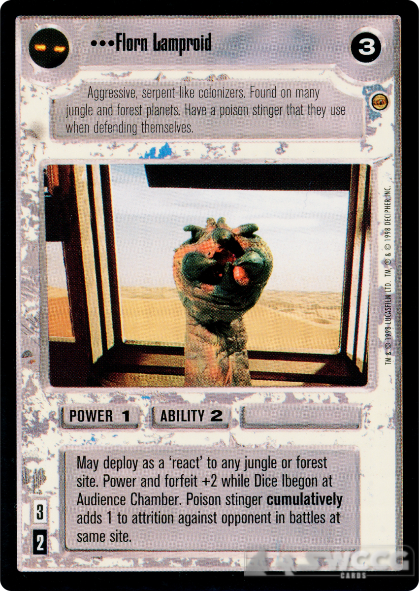 May deploy as a ‘react’ to any jungle or forest site. Power and forfeit +2 while Dice Ibegon at Audience Chamber. Poison stinger cumulatively adds 1 to attrition against opponent in battles at same site.