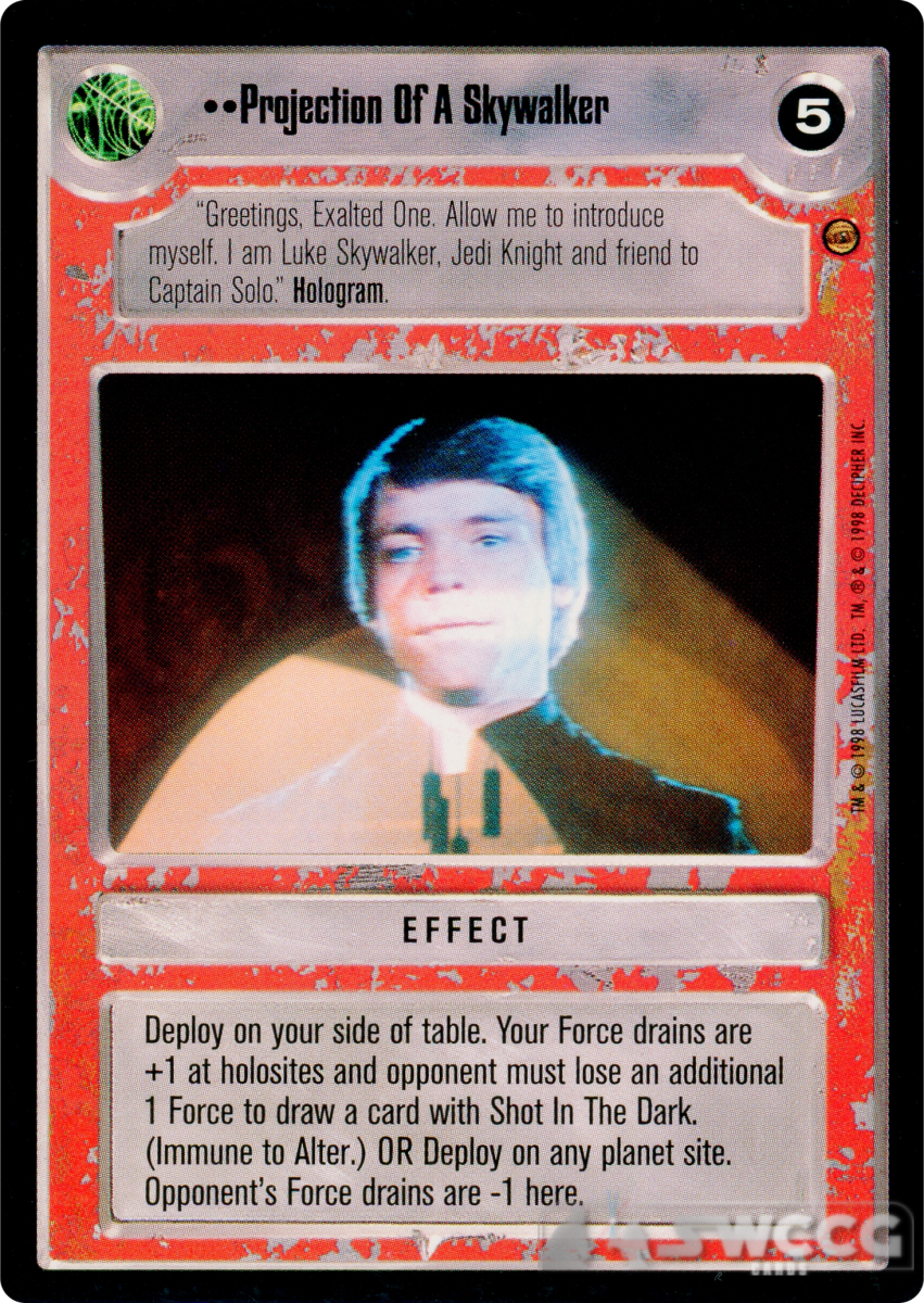 Deploy on your side of table. Your Force drains are +1 at holosites and opponent must lose an additional 1 Force to draw a card with Shot In The Dark. (Immune to Alter.) OR Deploy on any planet site. Opponent’s Force drains are -1 here.
