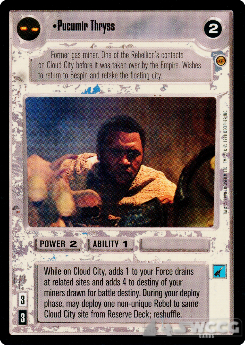 While on Cloud City, adds 1 to your Force drains at Cloud City sites and adds 4 to destiny of each of your miners drawn for battle destiny. During your deploy phase, may deploy one non-unique Rebel to same Cloud City site from Reserve Deck; reshuffle.