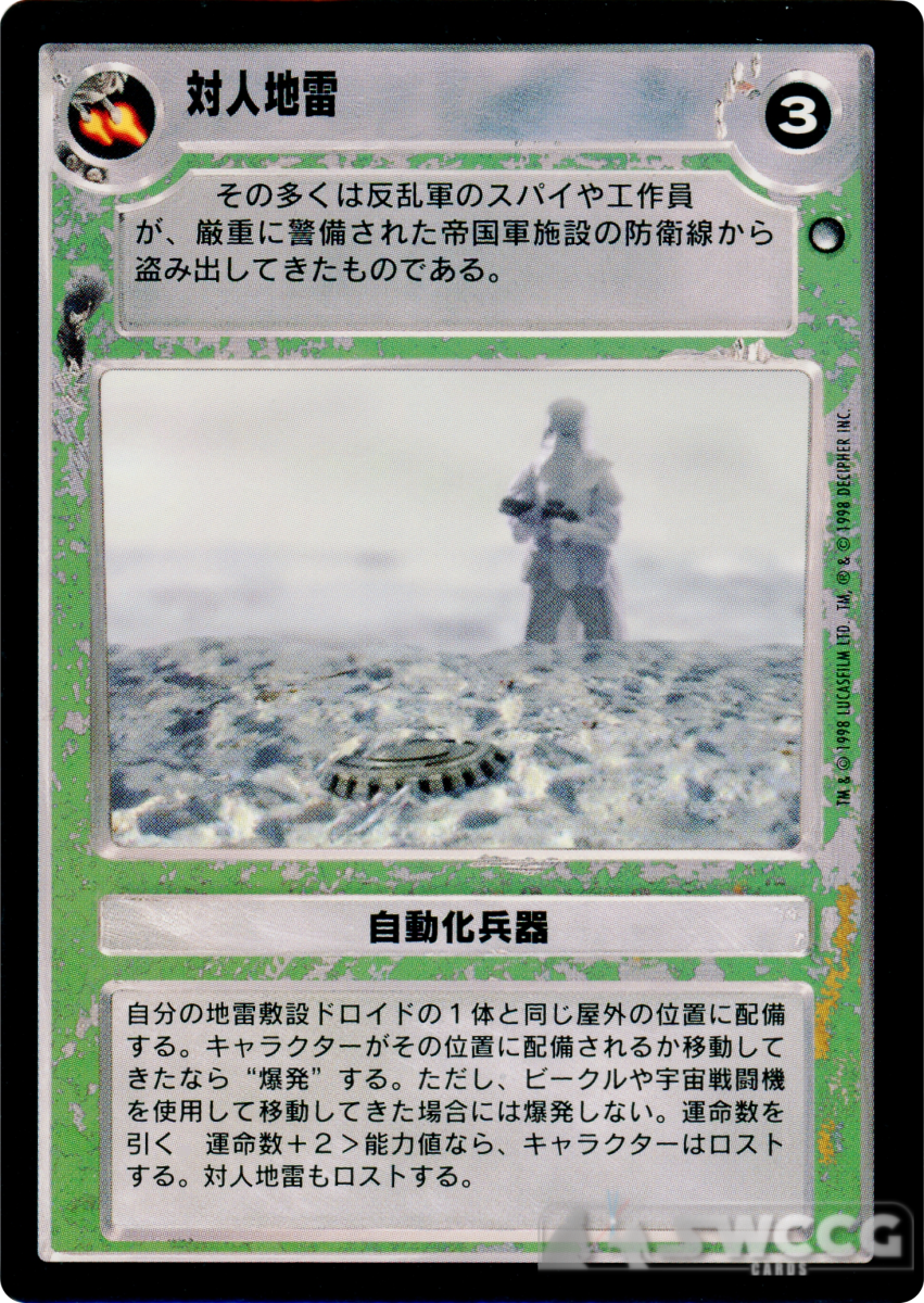 Deploy at same exterior site as your mining droid. ‘Explodes’ if a character deploys or moves (without using a vehicle or starfighter) to or across same site. Draw destiny. Character lost if destiny +2 > ability. Infantry Mine is also lost.