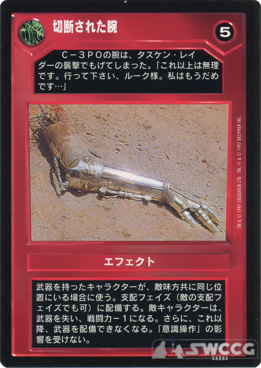 If both players have a character with a weapon present at same site, deploy on that opponent’s character during any control phase. Character loses all weapons, is power -1 and may no longer carry weapons. (Immune to Alter.)