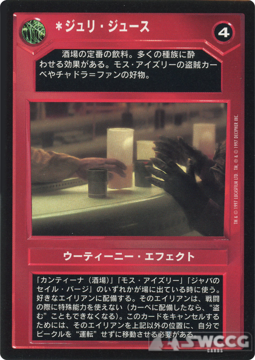 Deploy on any alien if Cantina, Mos Eisley or Jabba’s Sail Barge on table. That alien may not use ability in battles (if Kabe, she also cannot ‘steal’). Utinni Effect canceled by moving that alien to one of those sites without ‘driving’ a vehicle.