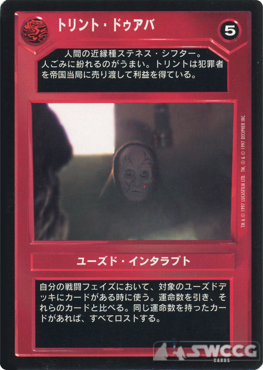A Stennes Shifter, a near-human race. Have ability to blend unnoticed into crowds. Trinto profits from turning lawbreakers over to Imperial authorities.