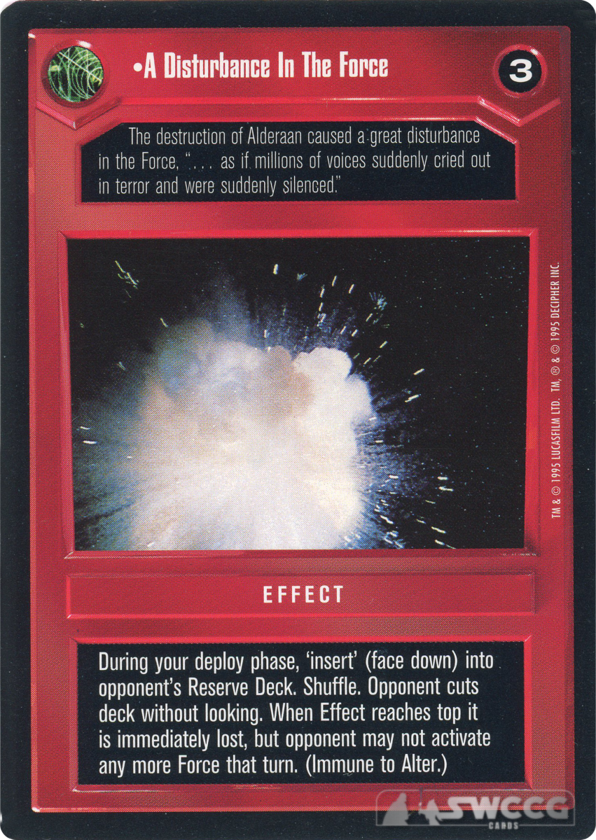 Once per game, during your deploy phase, ‘insert’ (face down) into opponent’s Reserve Deck; reshuffle. When effect reaches top it is immediately lost, but opponent may not activate any more Force that turn. (Immune to Alter.)