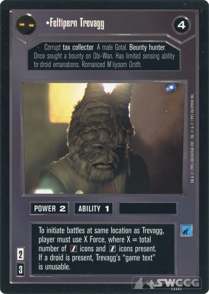 While no droid present with Trevagg, to initiate battles at same location as Trevagg, player must use X Force, where X = total number of [Dark Side Force] and [Light Side Force] present with him.