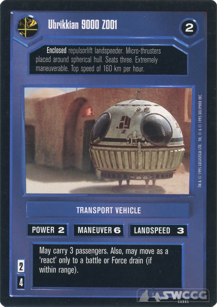 Enclosed repulsorlift landspeeder. Micro-thrusters placed around spherical hull. Seats three. Extremely maneuverable. Top speed of 160 km per hour.