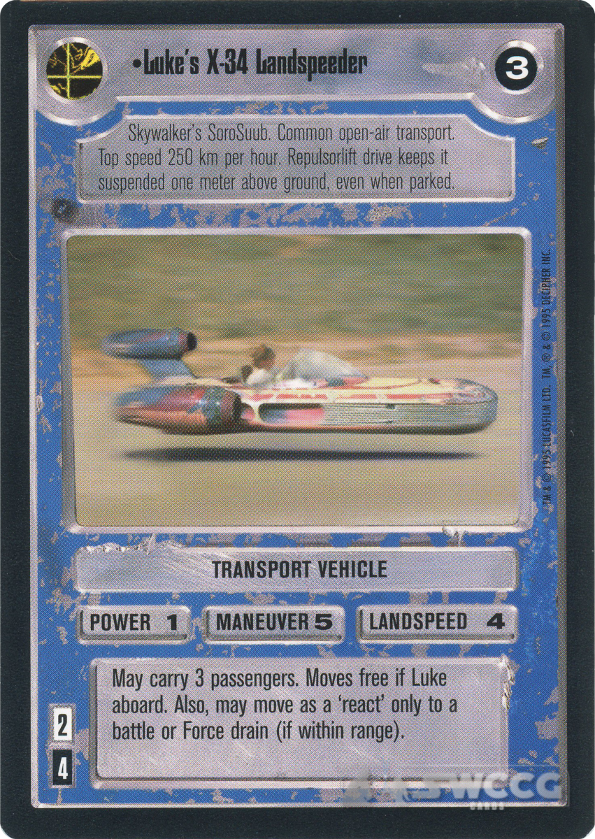 Skywalker’s SoroSuub. Common open (AI)r transport. Top speed 250 km per hour. Repulsorlift drive keeps it suspended one meter above ground, even when parked.