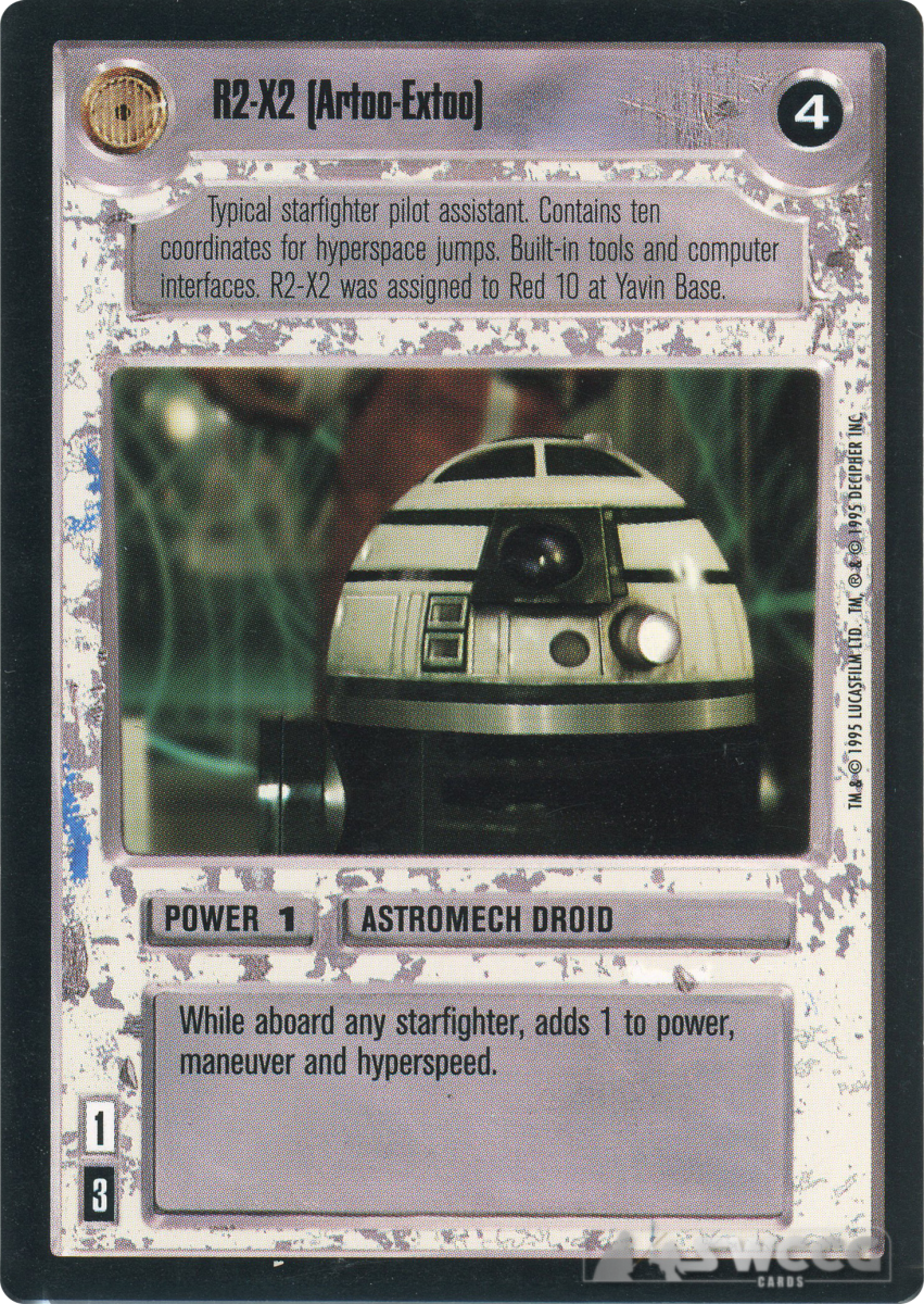 Typical starfighter pilot assistant. Contains ten coordinates for hyperspace jumps. Built-in tools and computer interfaces. R2-X2 was assigned to Red 10 at Yavin Base.