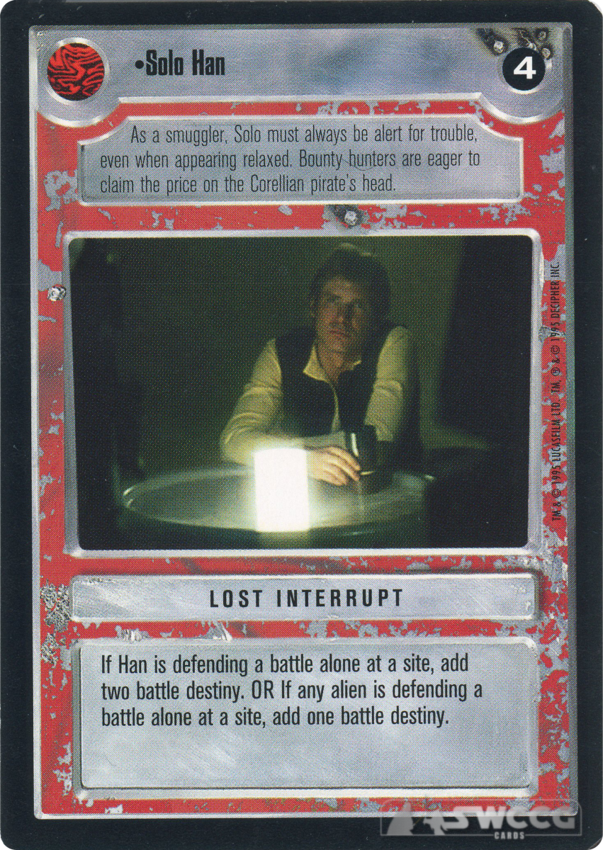 If Han is defending a battle alone at a site, add two battle destiny. OR If any alien is defending a battle alone at a site, add one battle destiny.