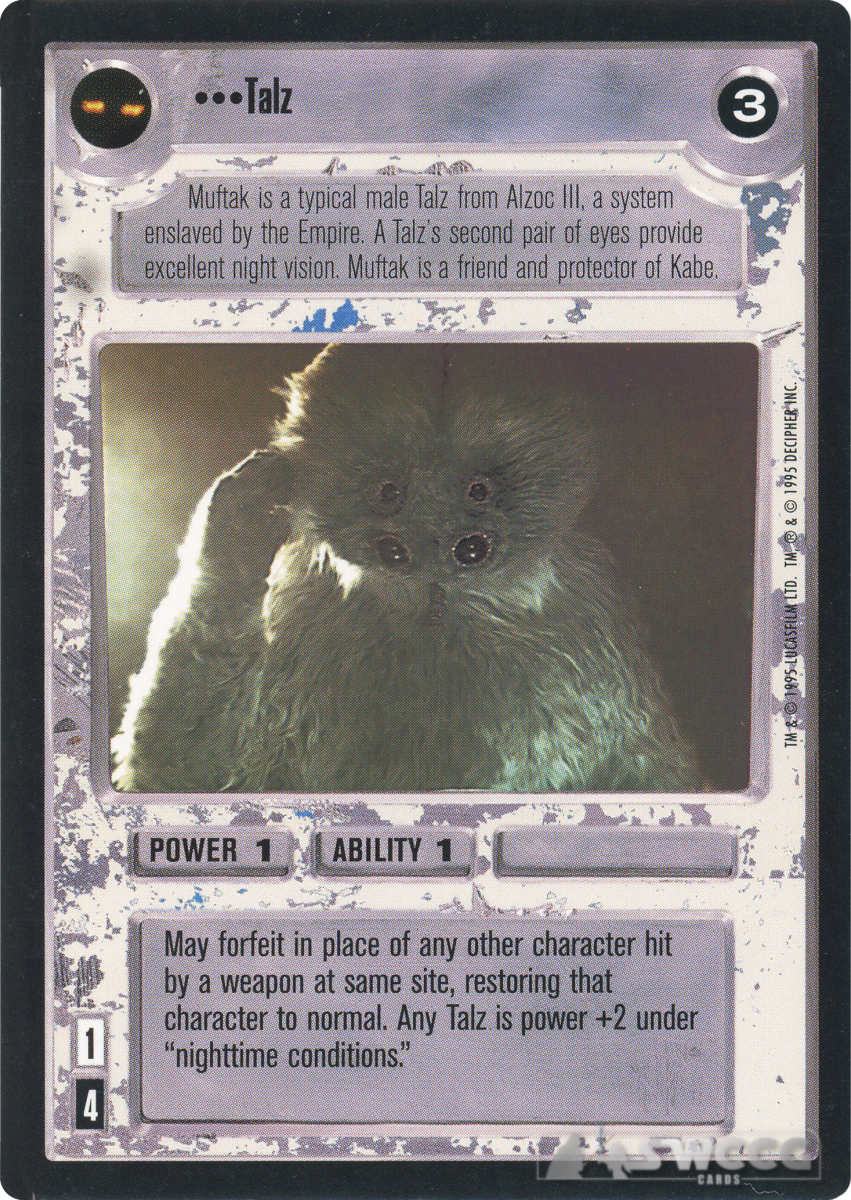 May forfeit in place of any other character hit by a weapon at same site, restoring that character to normal. Any Talz is power +2 under ‘nighttime conditions’.