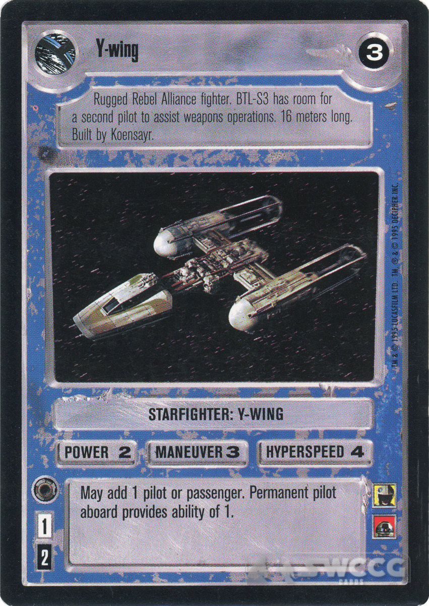 Rugged Rebel Alliance fighter. BTL-S3 has room for a second pilot to assist weapons operations. 16 meters long. Built by Koensayr.
