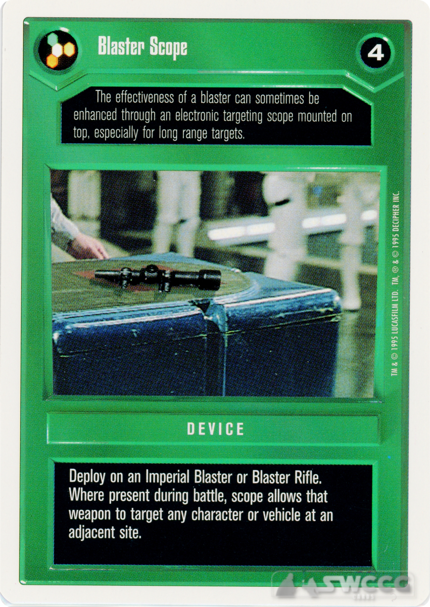 Deploy on your non-[Permanent Weapon] blaster. Scope allows that weapon to target at an adjacent site.