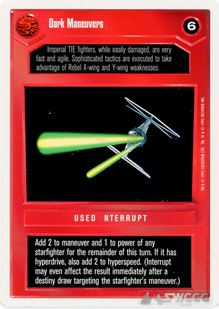 Add 2 to maneuver and 1 to power of any starfighter for the remainder of this turn. If it has hyperdrive, also add 2 to hyperspeed. (Interrupt may even affect the result immediately after a destiny draw targeting the starfighter’s maneuver.)