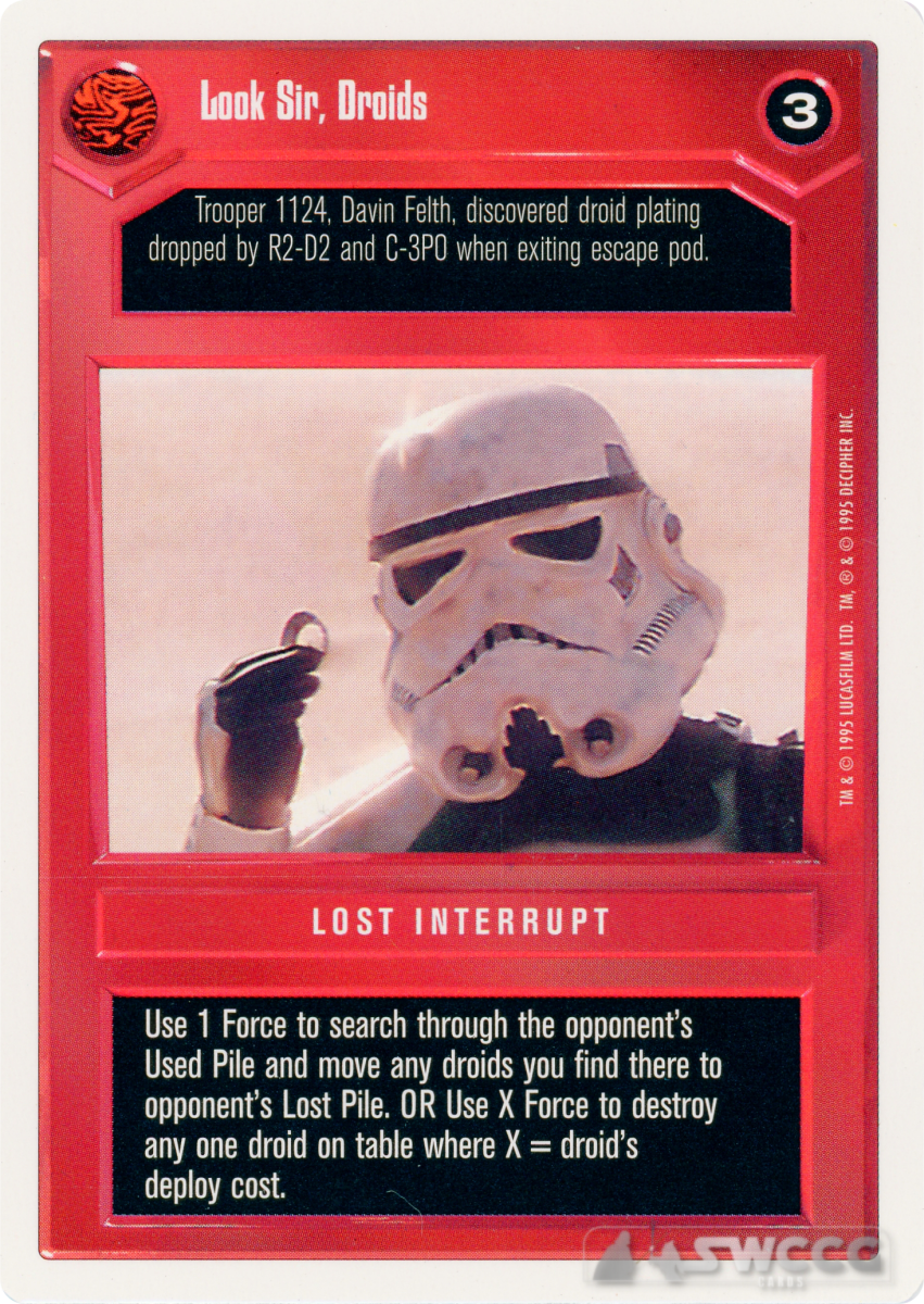 Use 1 Force to search through the opponent’s Used Pile and move any droids you find there to opponent’s Lost Pile. OR Use X Force to destroy any one droid on table where X = droid’s deploy cost.