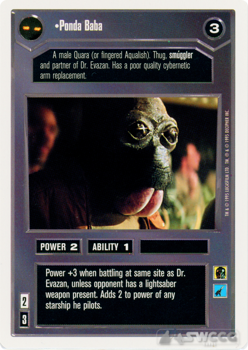 Power +3 when battling at same site as Dr. Evazan, unless opponent has a lightsaber present. Adds 2 to power of anything he pilots.