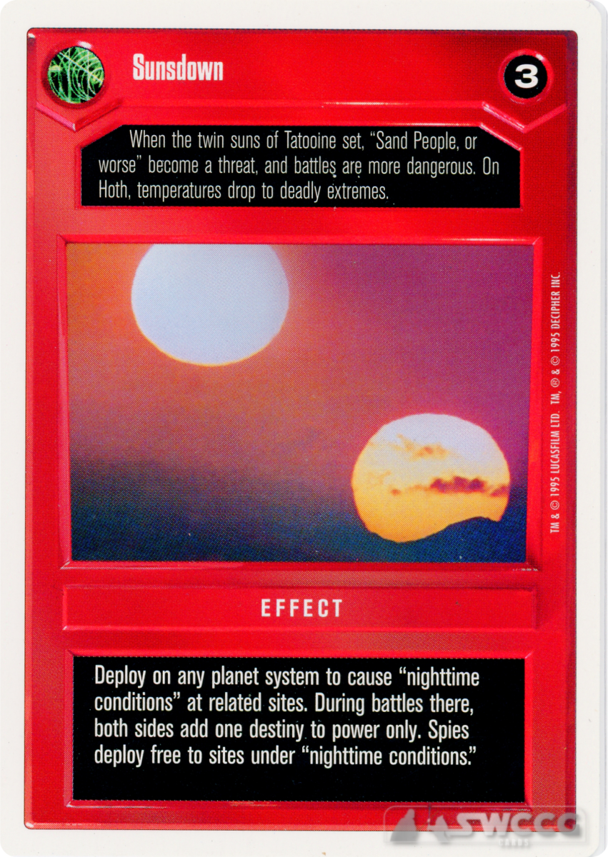 Deploy on any planet system to cause ‘nighttime conditions’ at related sites. During battles there, both sides add one destiny to power only. Spies deploy free to sites under ‘nighttime conditions.’