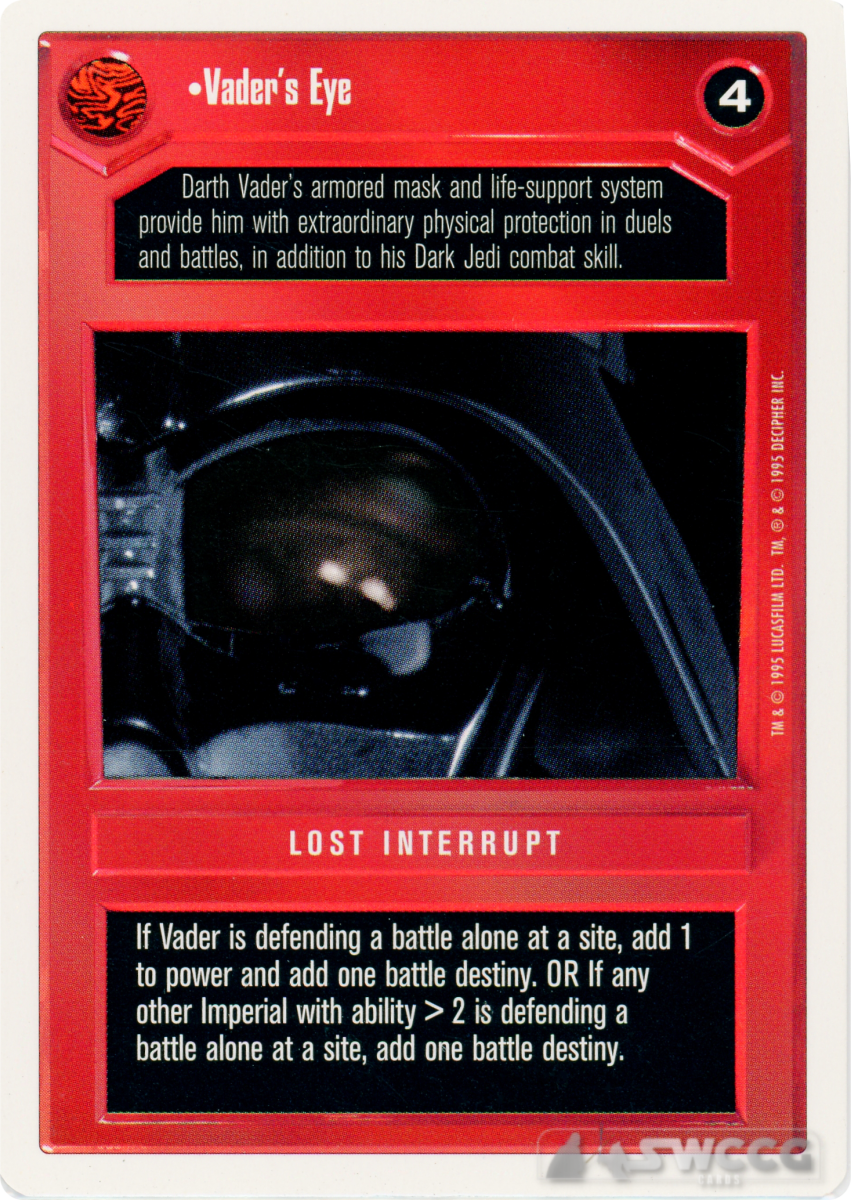 If Vader is defending a battle alone at a site, add 1 to power and add one battle destiny. OR If any other Imperial with ability > 2 is defending a battle alone at a site, add one battle destiny.