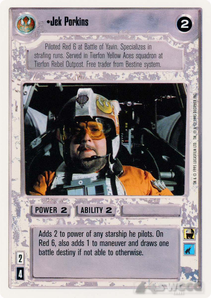Adds 2 to power of anything he pilots. When piloting Red 6, also adds 1 to maneuver and draws one battle destiny if not able to otherwise.