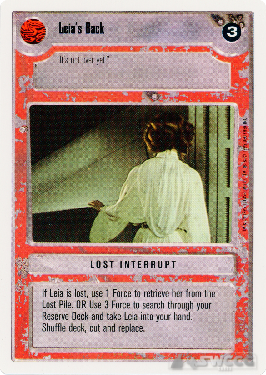 If Leia is lost, use 1 Force to retrieve her from the Lost Pile. OR Use 3 Force to search through your Reserve Deck and take Leia into your hand. Shuffle deck, cut and replace.