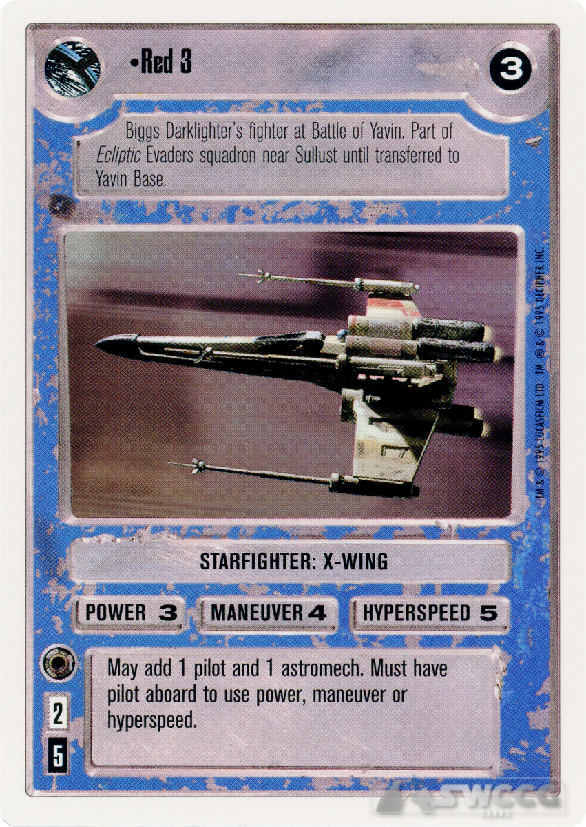 Biggs Darklighter’s fighter at Battle of Yavin. Part of Ecliptic Evaders squadron near Sullust until transferred to Yavin Base.