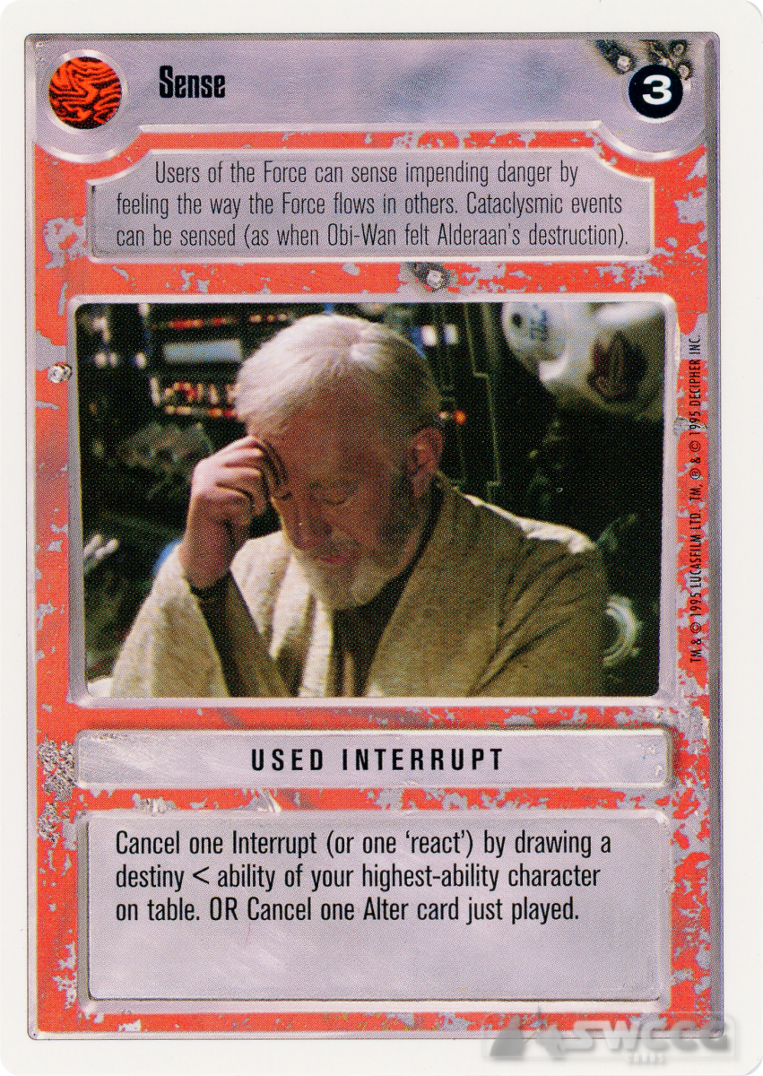 If opponent just played an Interrupt (or just initiated a ‘react’), target one of your characters on table. Draw destiny. If destiny < ability of target, that Interrupt (or 'react') is canceled. OR Cancel Alter.