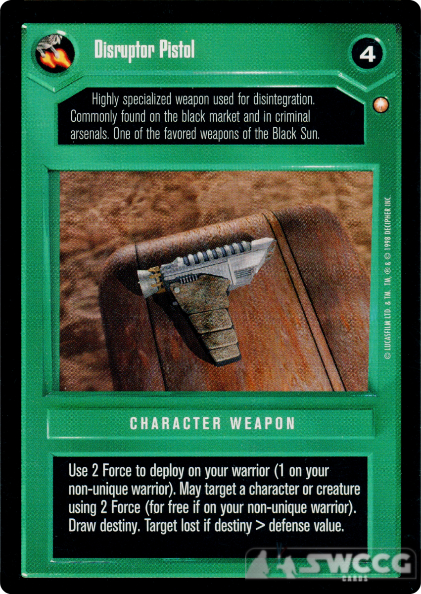 Use 2 Force to deploy on your warrior (1 on your non-unique warrior). May target a character or creature using 2 Force (for free if on your non-unique warrior). Draw destiny. Target lost if destiny > defense value.