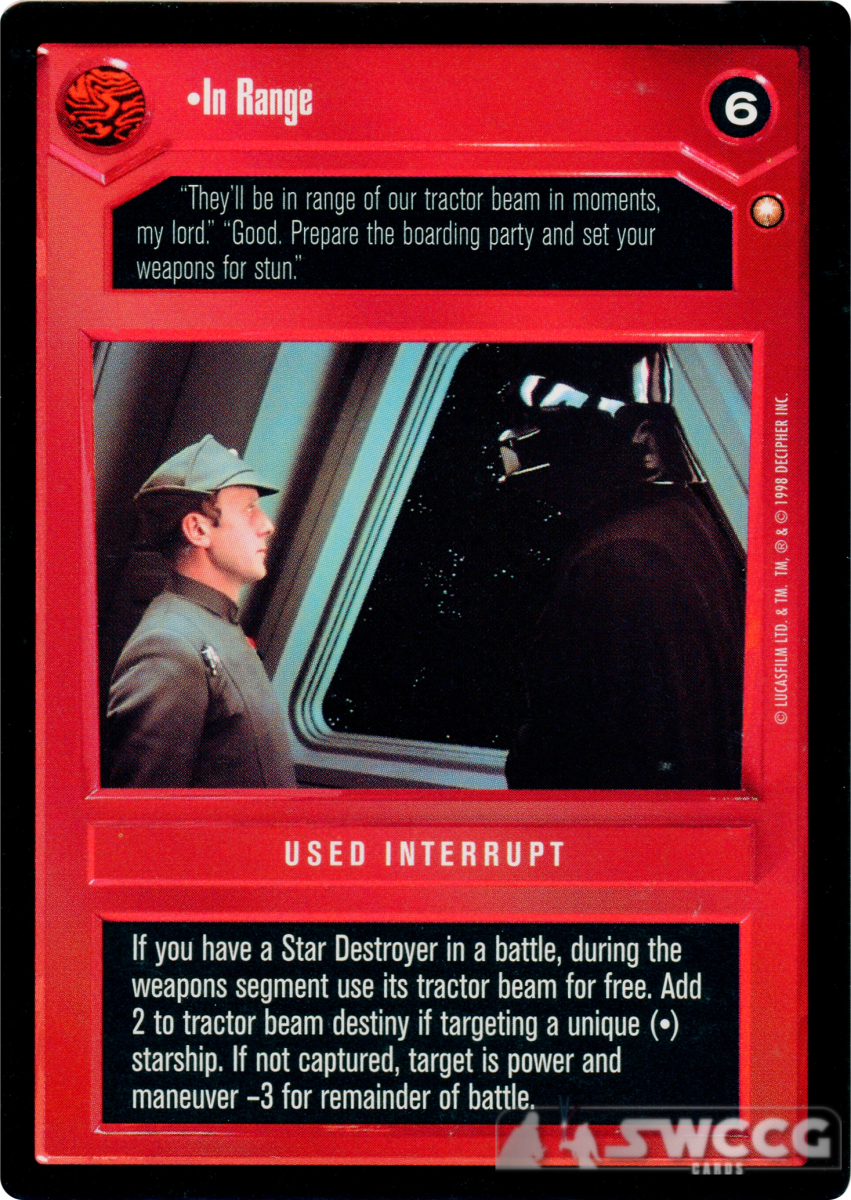 If you have a Star Destroyer in a battle, during the weapons segment use its tractor beam for free. Add 2 to tractor beam destiny if targeting a unique (•) starship. If not captured, target is power and maneuver -3 for remainder of turn.