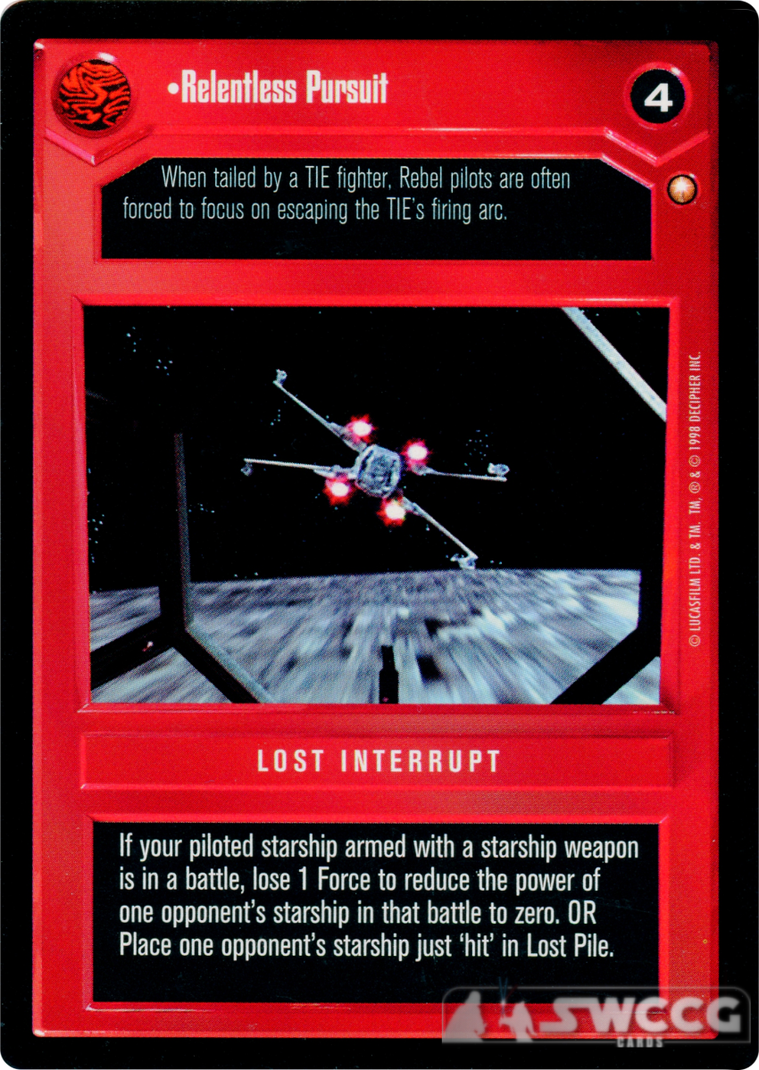 If your piloted starship armed with a starship weapon is in a battle, lose 1 Force to reduce the power of one opponent’s starship in that battle to zero. OR Place one opponent’s starship just ‘hit’ in Lost Pile.