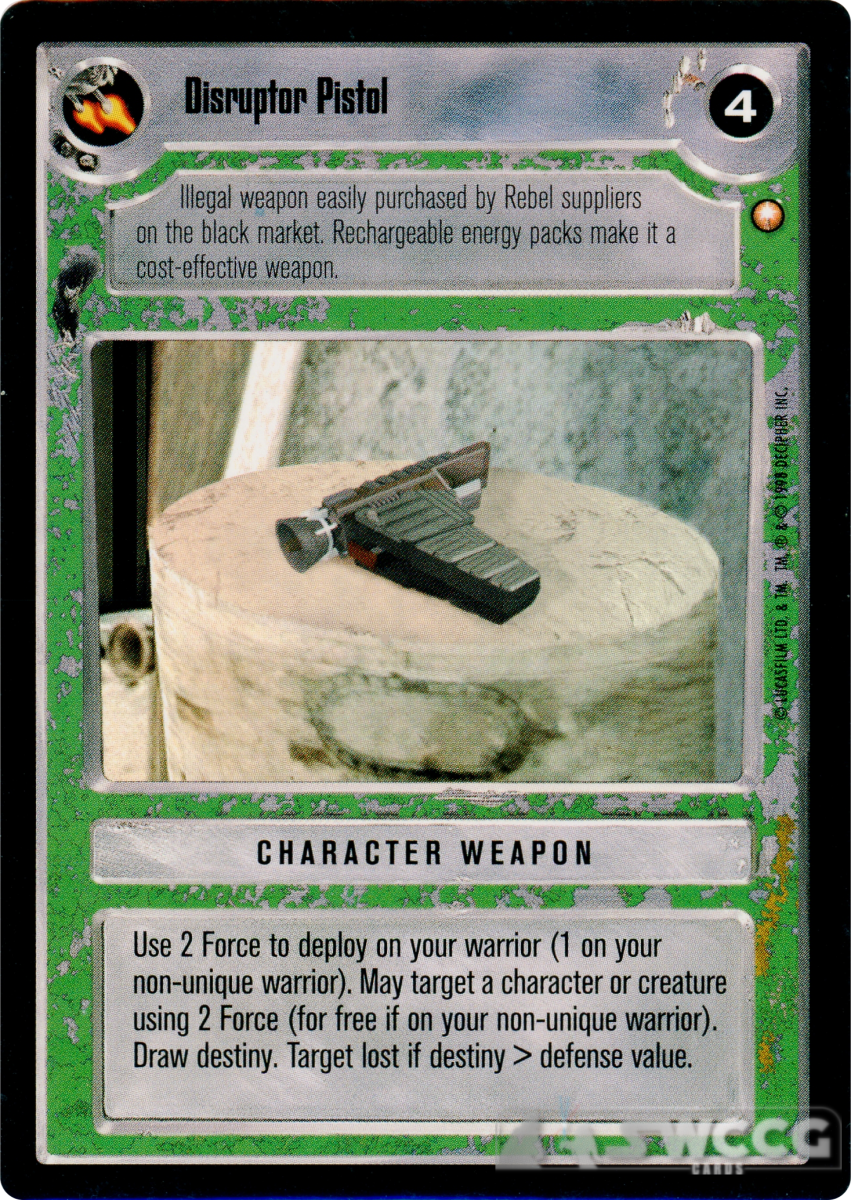 Use 2 Force to deploy on your warrior (1 on your non-unique warrior). May target a character or creature using 2 Force (for free if on your non-unique warrior). Draw Destiny. Target lost if destiny > defense value.
