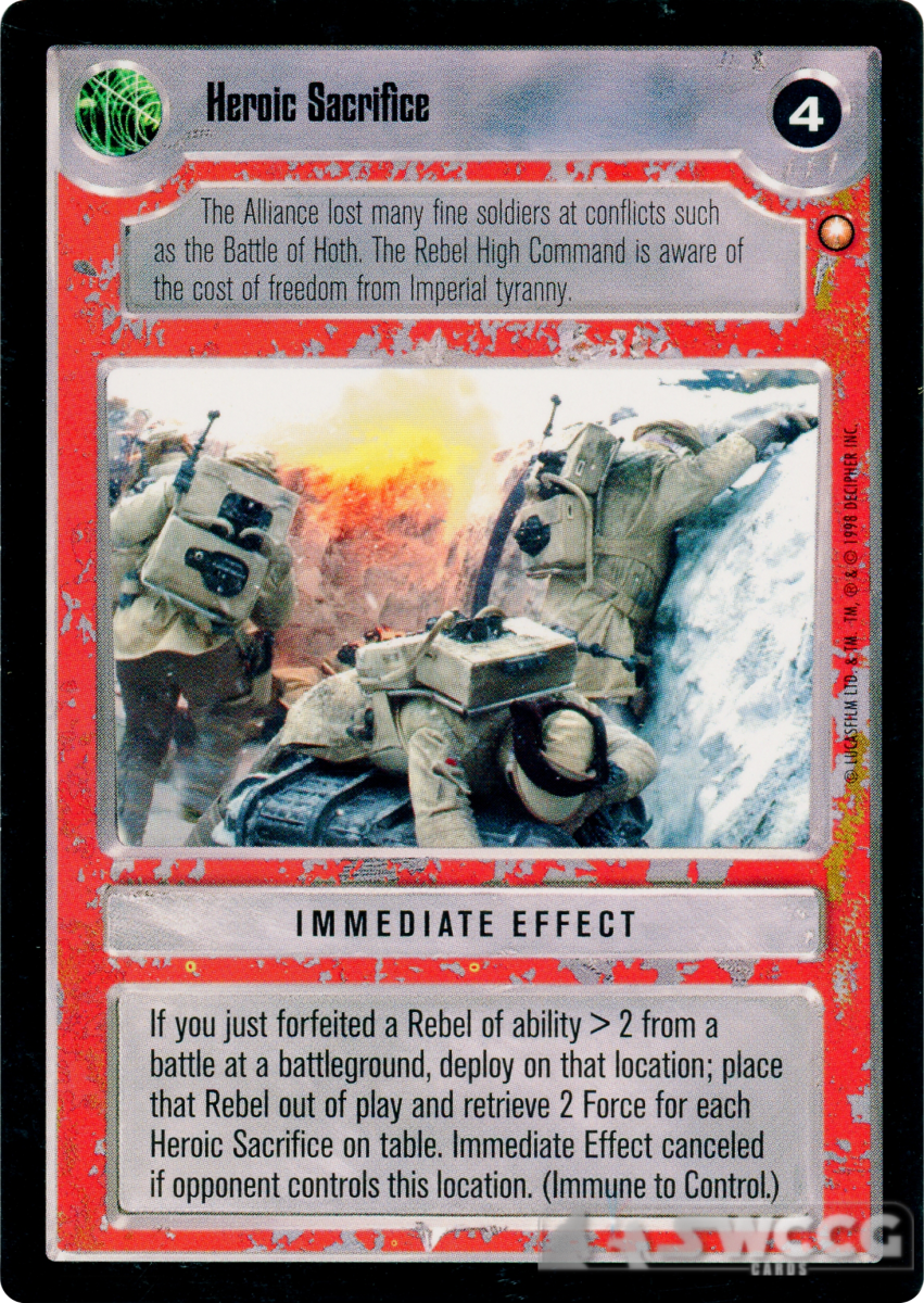 If you just forfeited a Rebel of ability > 2 from a battle at a battleground, deploy on that location; place that Rebel out of play and retrieve 2 Force for each Heroic Sacrifice on table. Immediate Effect canceled if opponent controls this location. (Immune to Control.)
