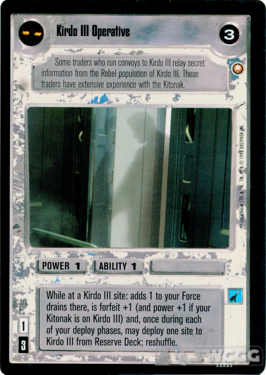 While at a Kirdo III site: adds 1 to your Force drains there, is forfeit +1 (and power +1 if your Kitonak is on Kirdo III) and, once during each of your deploy phases, may deploy one site to Kirdo III from Reserve Deck; reshuffle.