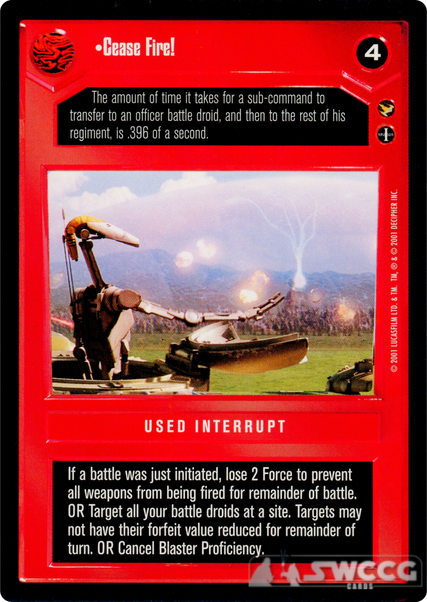 If a battle was just initiated, lose 2 Force to prevent all weapons from being fired for remainder of battle. OR Target all your battle droids at a site. Targets may not have their forfeit value reduced for remainder of turn. OR Cancel Blaster Proficiency.