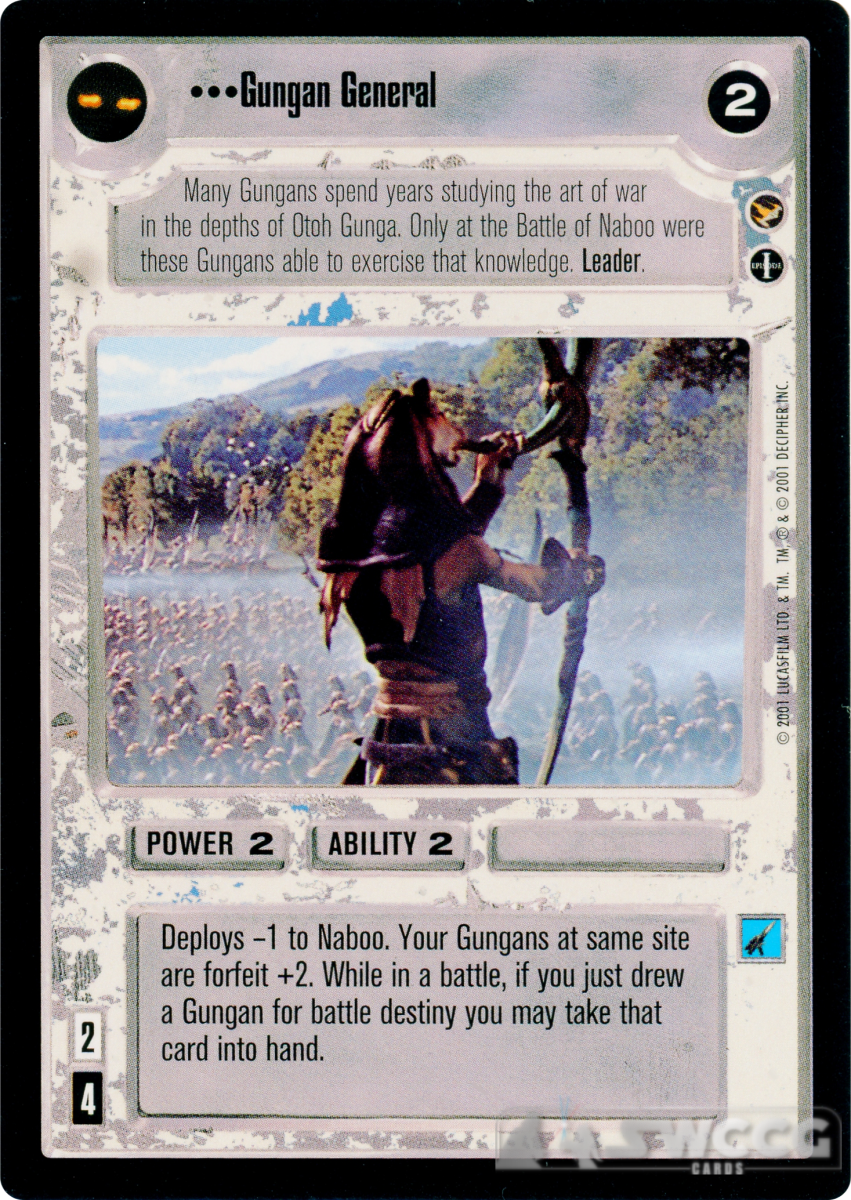 Deploys -1 to Naboo. Your Gungans at same site are firfeit +2. While in a battle, if you just drew a Gungan for battle destiny you may take that card into hand.