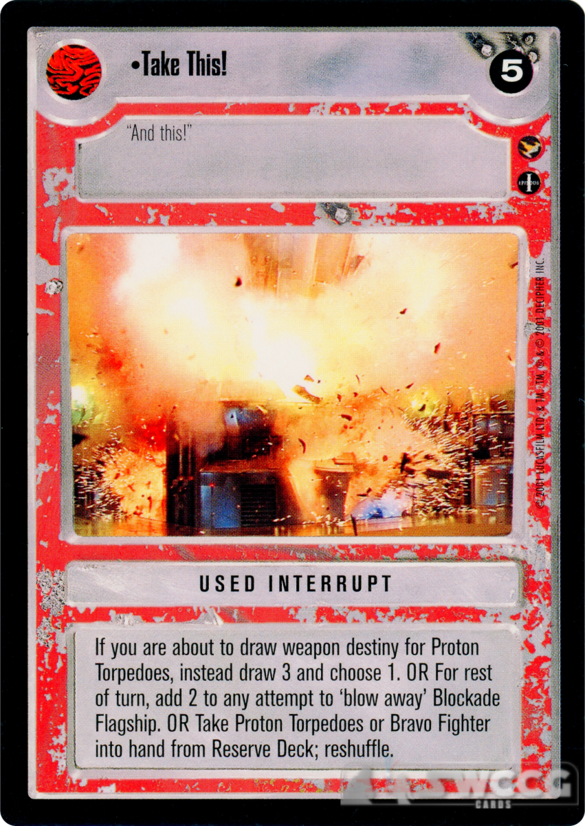 If you are about to draw weapon destiny for Proton Torpedoes, instead draw 3 and choose 1. OR For rest of turn, add 2 to any attempt to ‘blow away’ Blockade Flagship. OR Take Proton Torpedoes or Bravo Fighter into hand from Reserve Deck; reshuffle.